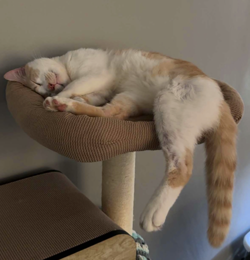 I wanted to let you know Riggs is doing amazing!! He and Tardis are getting along beautifully. He loves pets and will meow to get your attention. We all love him so much already! He's a dream! The picture is him last night relaxing after a long day of chasing Tardis around the house and raiding the cat toy box. Life is tough! Lol!